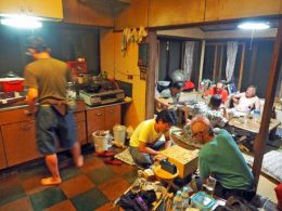 「ステーキをいただきながら、布袋様が裸で呑んでいます。往年のギタリストもいます。将棋部長も真剣に指しています。」(長野県旧明科町の石塚さん別荘で夏合宿)石塚さん、2015年8月11日